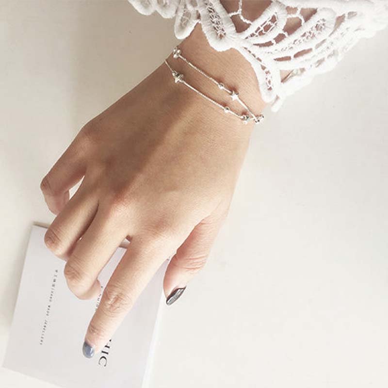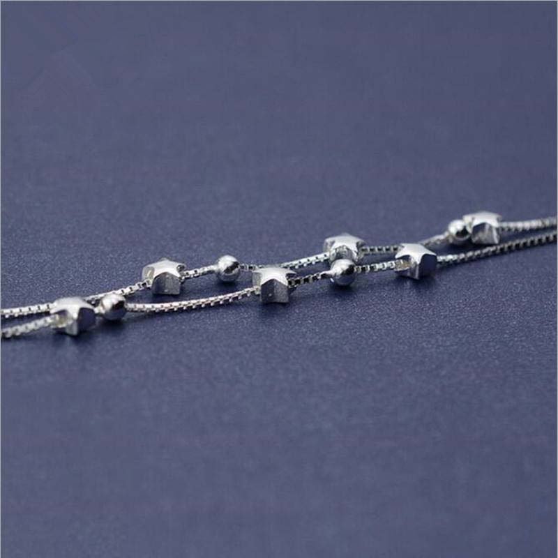 - Made of alloy/silver (finished with polished silver), the piece features a double-layer ultra-slim chain design, accented with spaced star charms and small beads—lightweight texture with refined detailing.