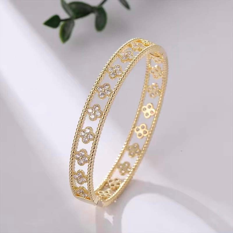 - Materials & Craftsmanship: Made of gold-plated/silver-plated alloy + fully inlaid imitation diamonds, the bangle is framed with fine beaded edges and evenly decorated with four-leaf clover-shaped full-diamond accents. The imitation diamonds are transparent and sparkling, while the beaded edge details add sophistication; paired with a push-button clasp, it opens and closes easily and securely, with an overall delicate and premium texture.