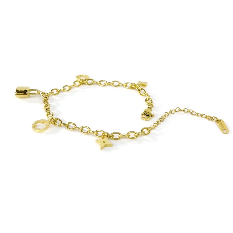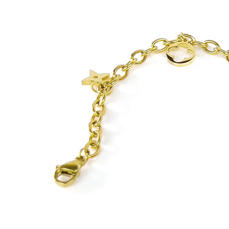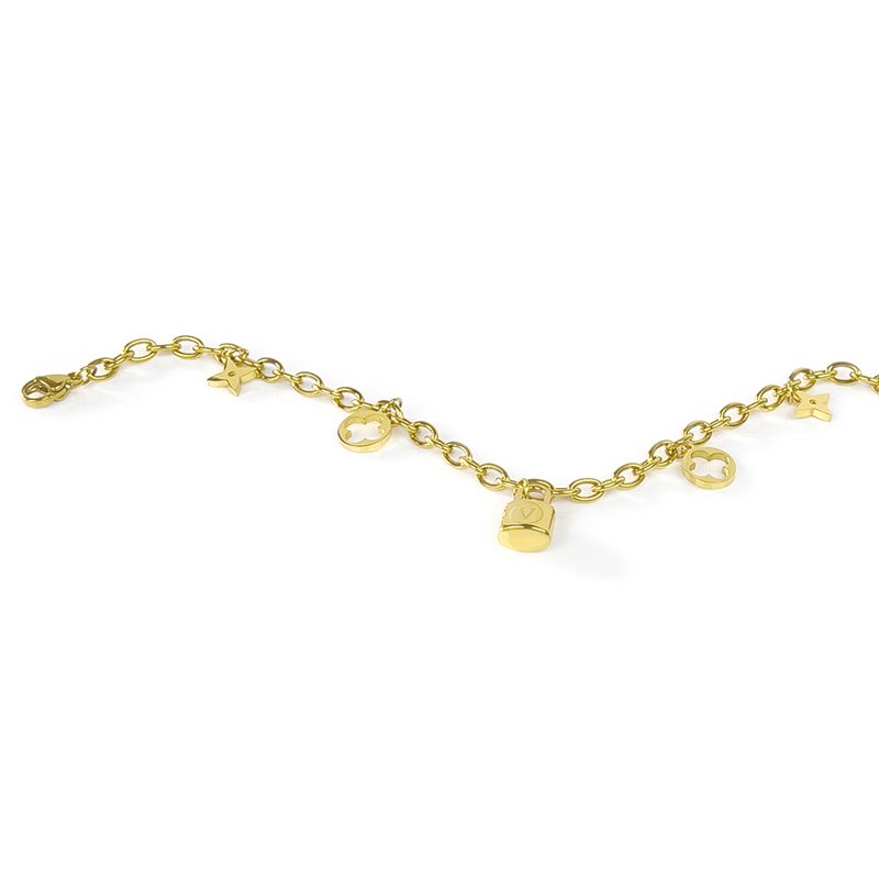 A delicate chain wraps gently around the wrist, where Monogram clovers, star charms, and the iconic LV padlock pendant nestle against a gilded backdrop—this bracelet feels less like an accessory, and more like a condensed narrative of the brand’s century-long legacy.