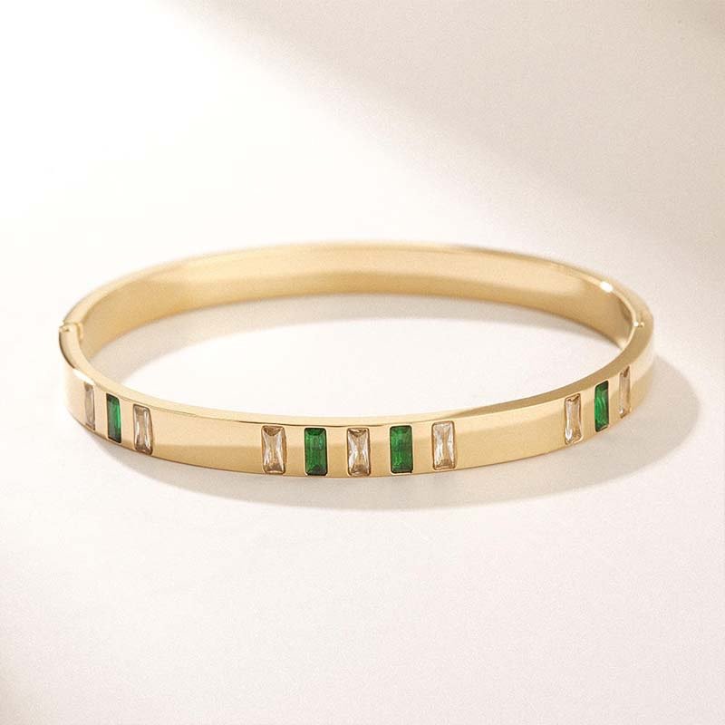 - Materials & Craftsmanship: Made of gold-plated alloy + imitation emerald (green) and imitation white diamond (transparent) gemstones, the bangle is inlaid with alternating rectangular-cut green and white gemstones. The gemstones have a rich, translucent luster, and the metal surface is glossy polished to present an exquisite retro gold texture; paired with a push-button clasp, it opens and closes easily and securely.