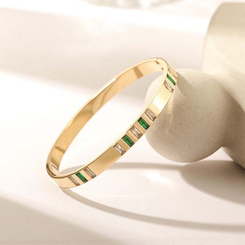 - Design Highlights: Centered around “thin-band bangle + green-and-white gemstone color block,” the slim shape fits snugly on the wrist for a sophisticated look. The green-and-white color block injects a retro luxurious vibe, and the rectangular cut gives the gemstone arrangement a more linear aesthetic; the combination of the gold base and gemstones exudes a high-end atmosphere, making it a refined accent to any outfit even when worn alone.