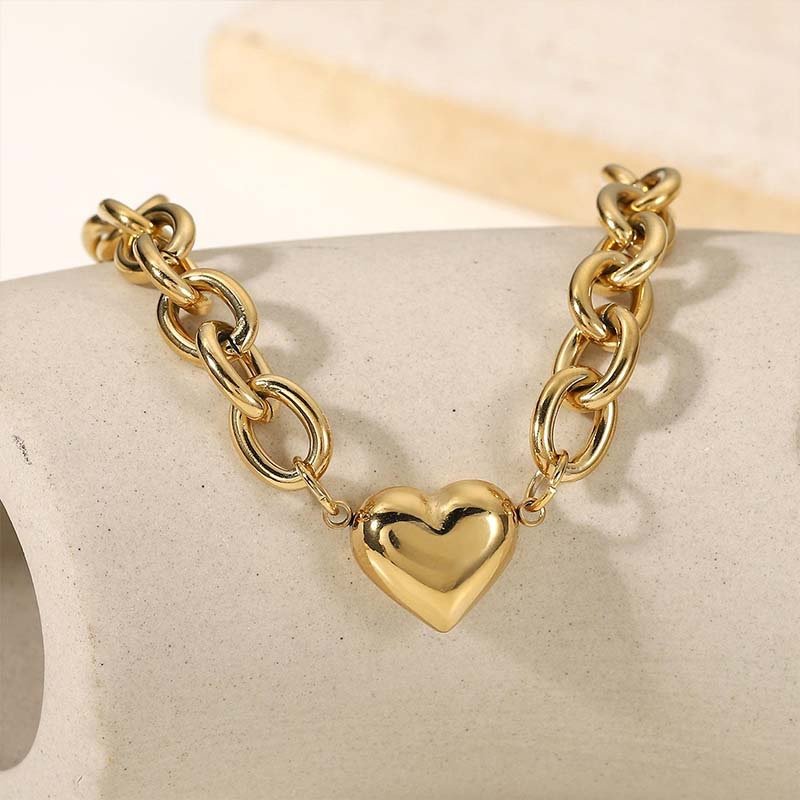 Built on a substantial gold chunky chain, the links feature rounded, interlocking loops that exude retro metallic texture. A 3D polished heart is centered on the chain: the soft heart motif balances the chain’s boldness, giving the piece both a “sleek edge” and subtle sweetness. The polished finish also enhances light reflection, making the bracelet a visual standout.