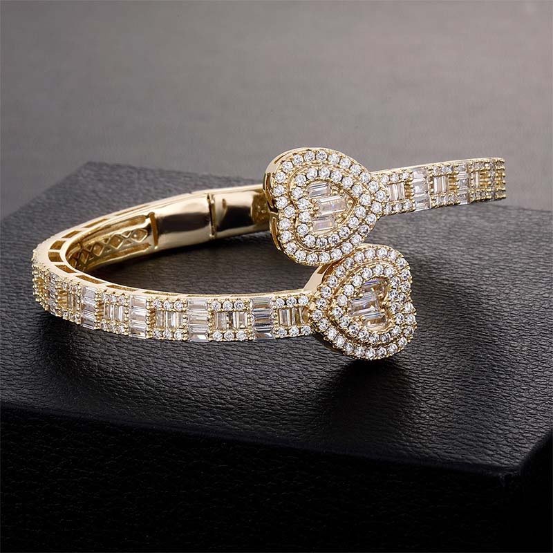 - Base material: Color-plated alloy (or precious metal). The bangle features a “center stone + pavé-set small diamonds” design: The heart-shaped focal point is inlaid with a rectangular-cut imitation diamond (or real diamond), surrounded by densely set small diamonds for a “halo” effect; the chain section of the bangle is also fully inlaid with rectangular-cut imitation diamonds, creating an all-over sparkling luxury look.