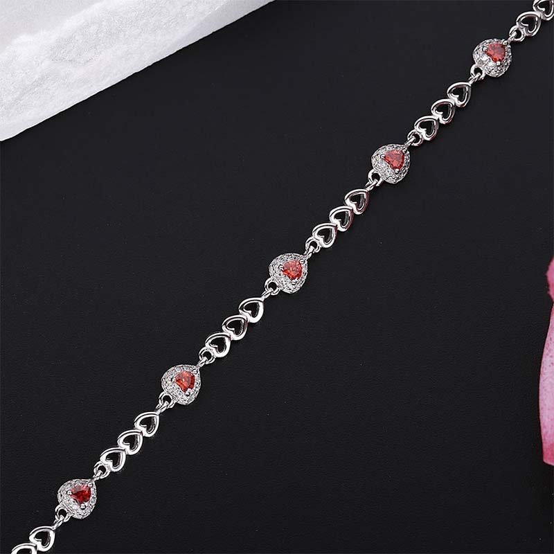 The main body is strung with silver heart-shaped links, paired with red heart decorations inlaid with crystals (red crystal surrounded by white crystals) — the sweet elements are full of romantic vibes.