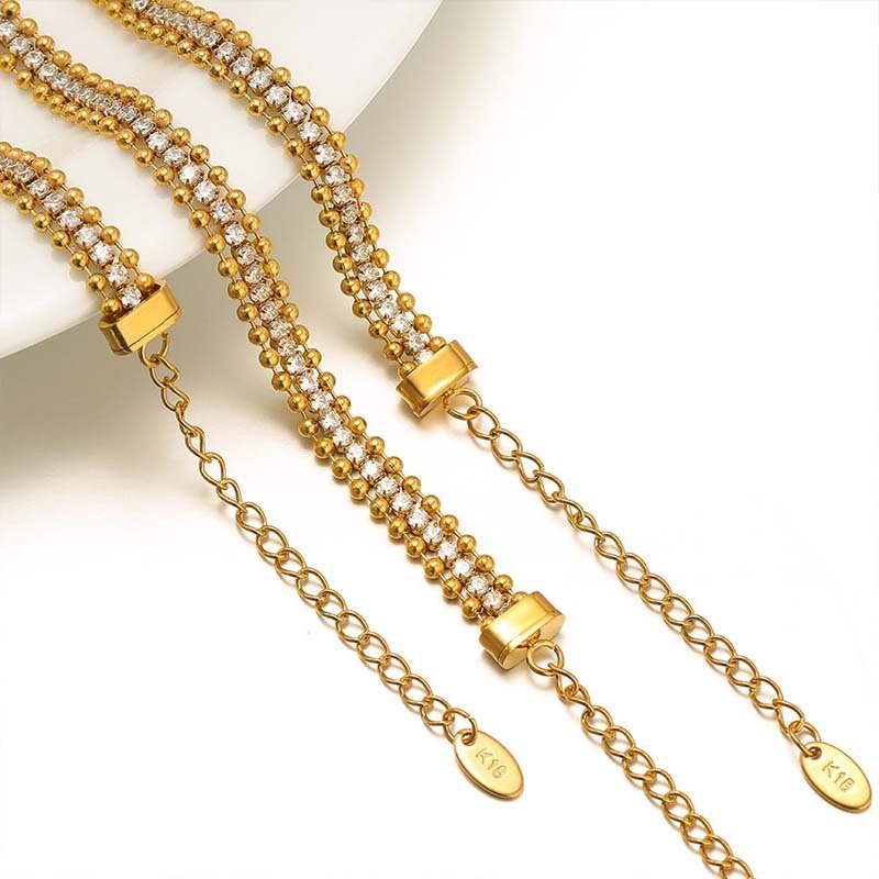 - Made of gold-plated alloy, it features a multi-strand design: the outer layer is a chain of rounded gold beads, while the middle layer is a diamond-embellished chain. The strands are interwoven for a cohesive, lustrous finish with rich texture.