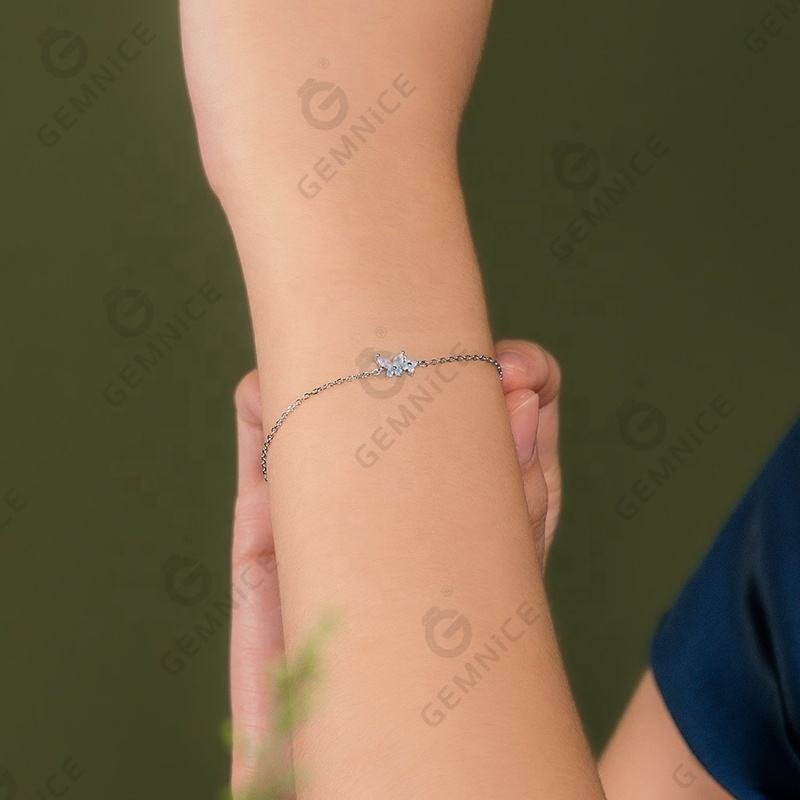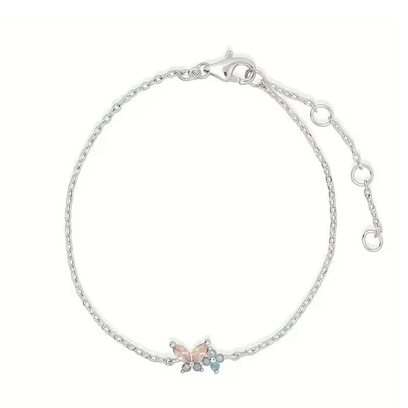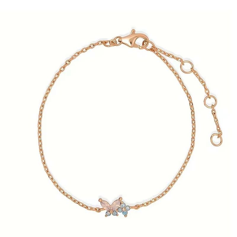 A slim gold cable chain paired with a tiny 3D charm: a soft pink butterfly + delicate light blue flower accents (inlaid with pastel crystals),adding a subtle,dreamy pop of color.