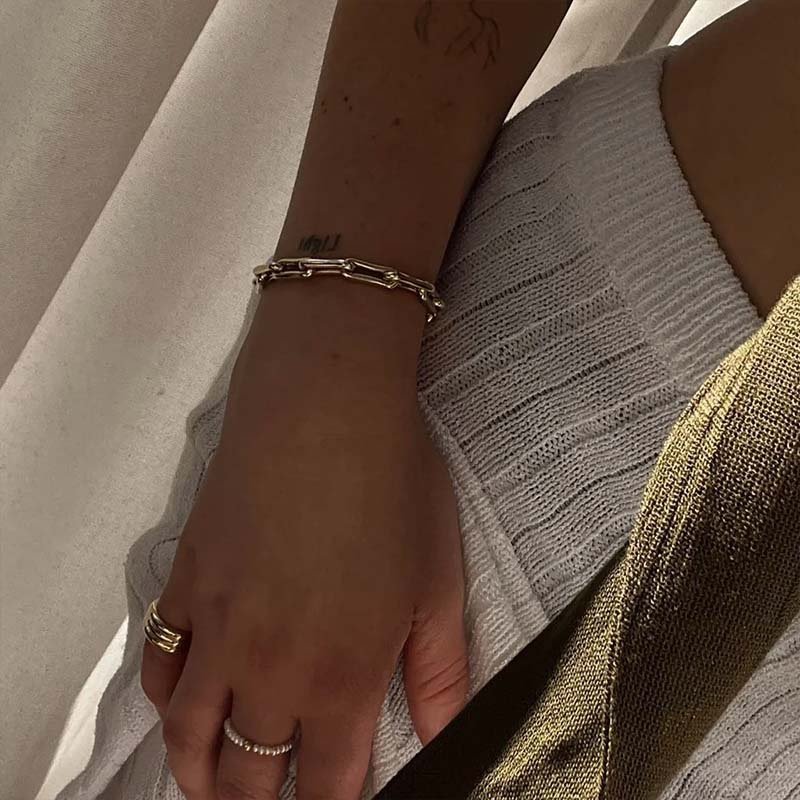 Centered on “thick rectangular links”: The simple geometric links exude a neutral retro vibe; the substantial texture elevates outfit sophistication—making it a “versatile texture essential.”