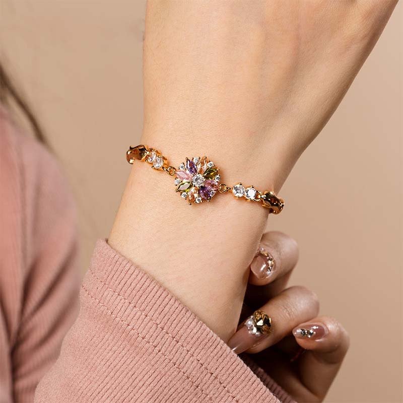 Crafted from polished rose gold, the bracelet features uniquely shaped “twisted” links that create a fluid, textured chain base. The focal point is a multi-colored floral charm: it’s adorned with pastel gemstones (including pink, purple, and green hues) clustered in a blooming flower shape, paired with small clear crystals for extra shimmer. The combination of the sleek link chain and the vibrant floral accent balances sophistication with playful charm.