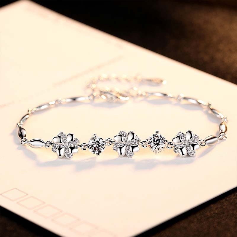 Crafted with a polished silver base,adorned with clustered flower charms (each petal inlaid with clear crystals) and tiny sparkling accents — the floral design looks delicate and luminous when catching light.