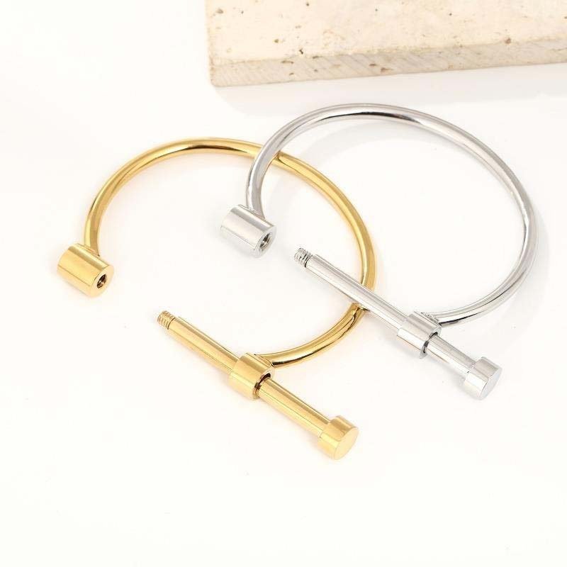 Centered on “minimalist polished bangle + geometric T-bar clasp”: The unadorned base pairs with any outfit, while the T-bar clasp adds industrial sharpness.