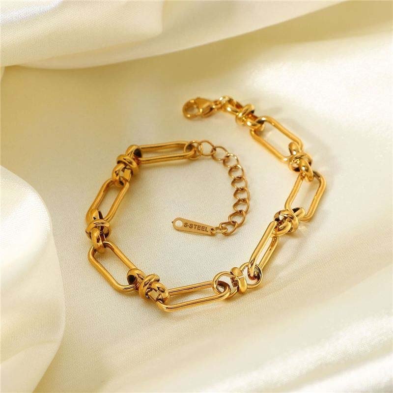 • Made of gold-plated polished alloy, the links feature a rectangular geometric shape with “twisted” details between loops—enhancing retro texture and 3D dimension.