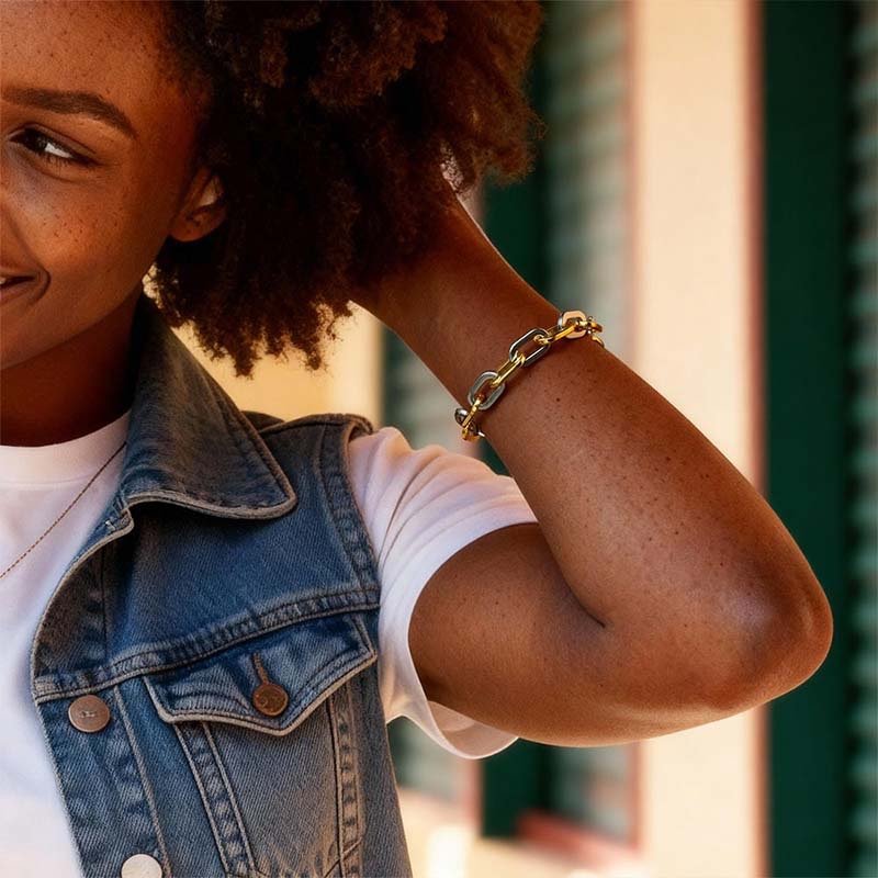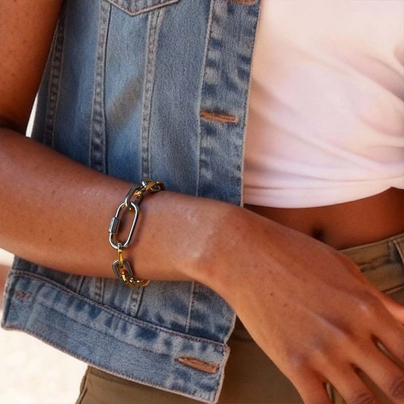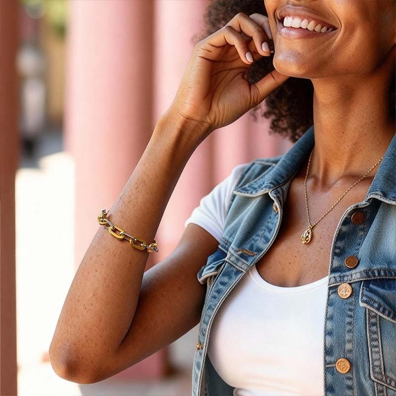 - Denim jackets/retro blazers: The color-block thick chain bracelet amplifies the retro tone of the outfit, boosting overall distinctiveness.