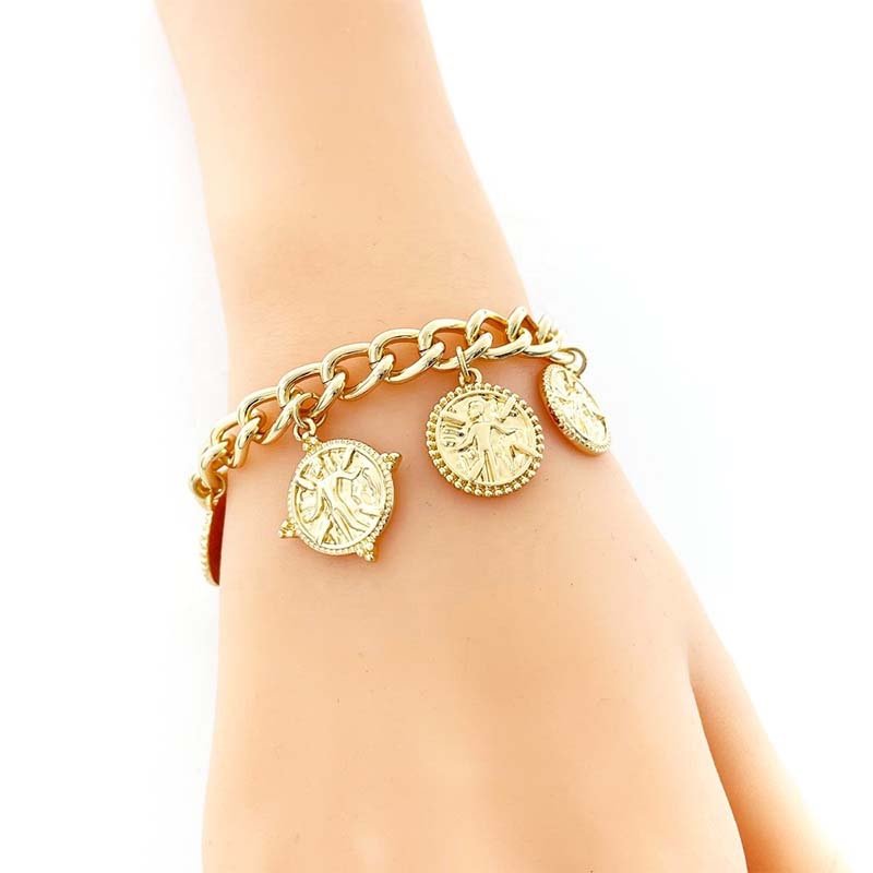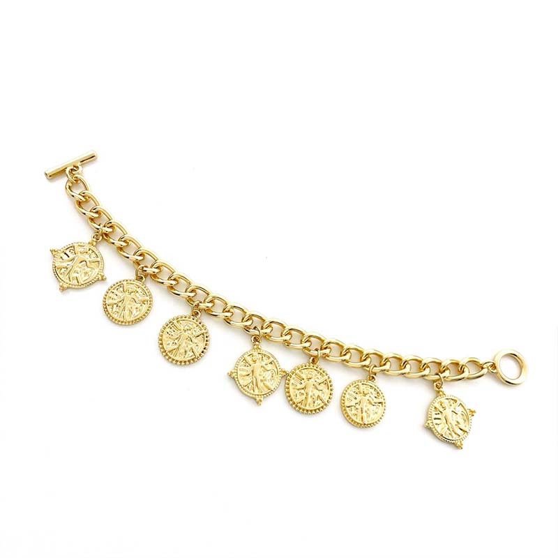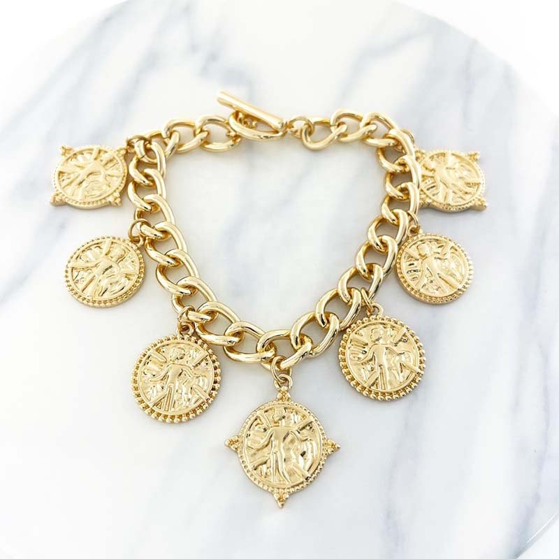Features a thick gold-tone curb chain paired with 6 coin-shaped charms (each engraved with detailed figure patterns, plus textured edges) — the toggle clasp adds a retro touch while ensuring easy wear.